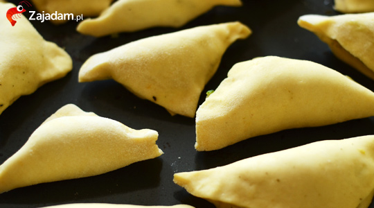 - Posklejałem palcami brzegi ciasta i ułożyłem pierogi na blasze wyłożonej papierem do pieczenia.
